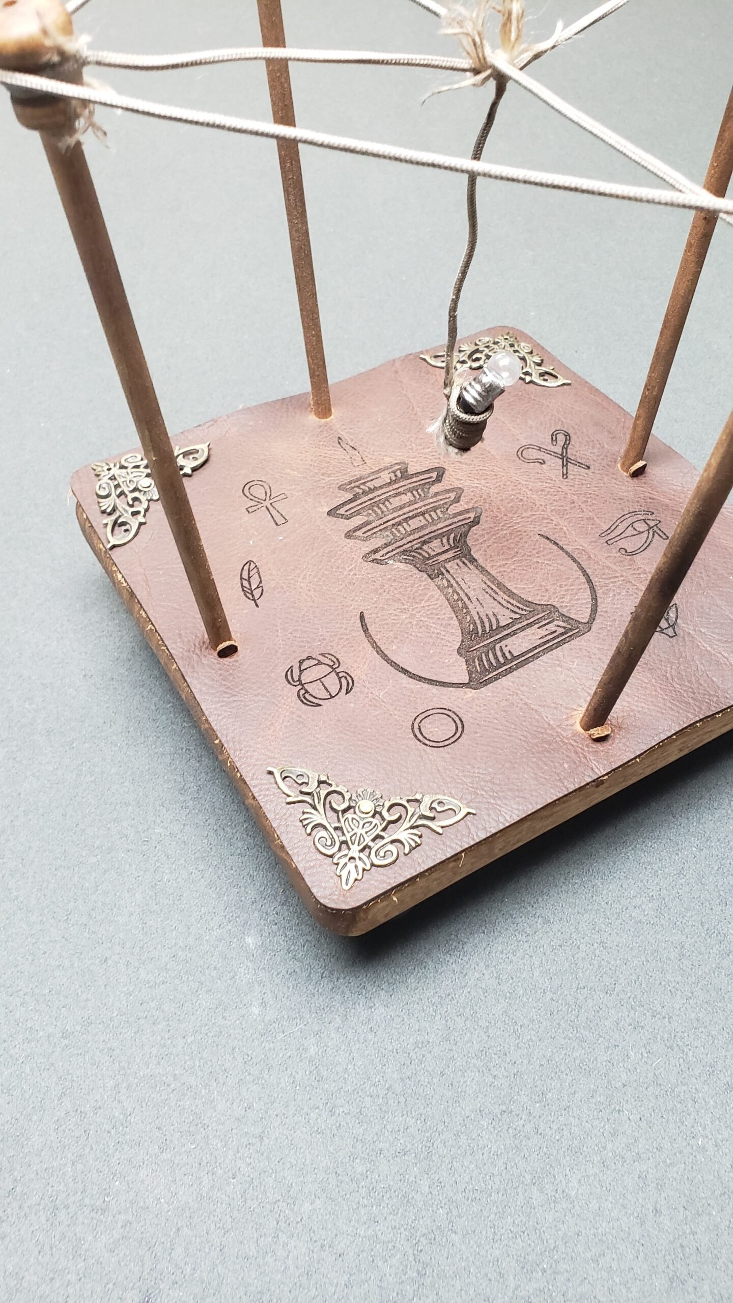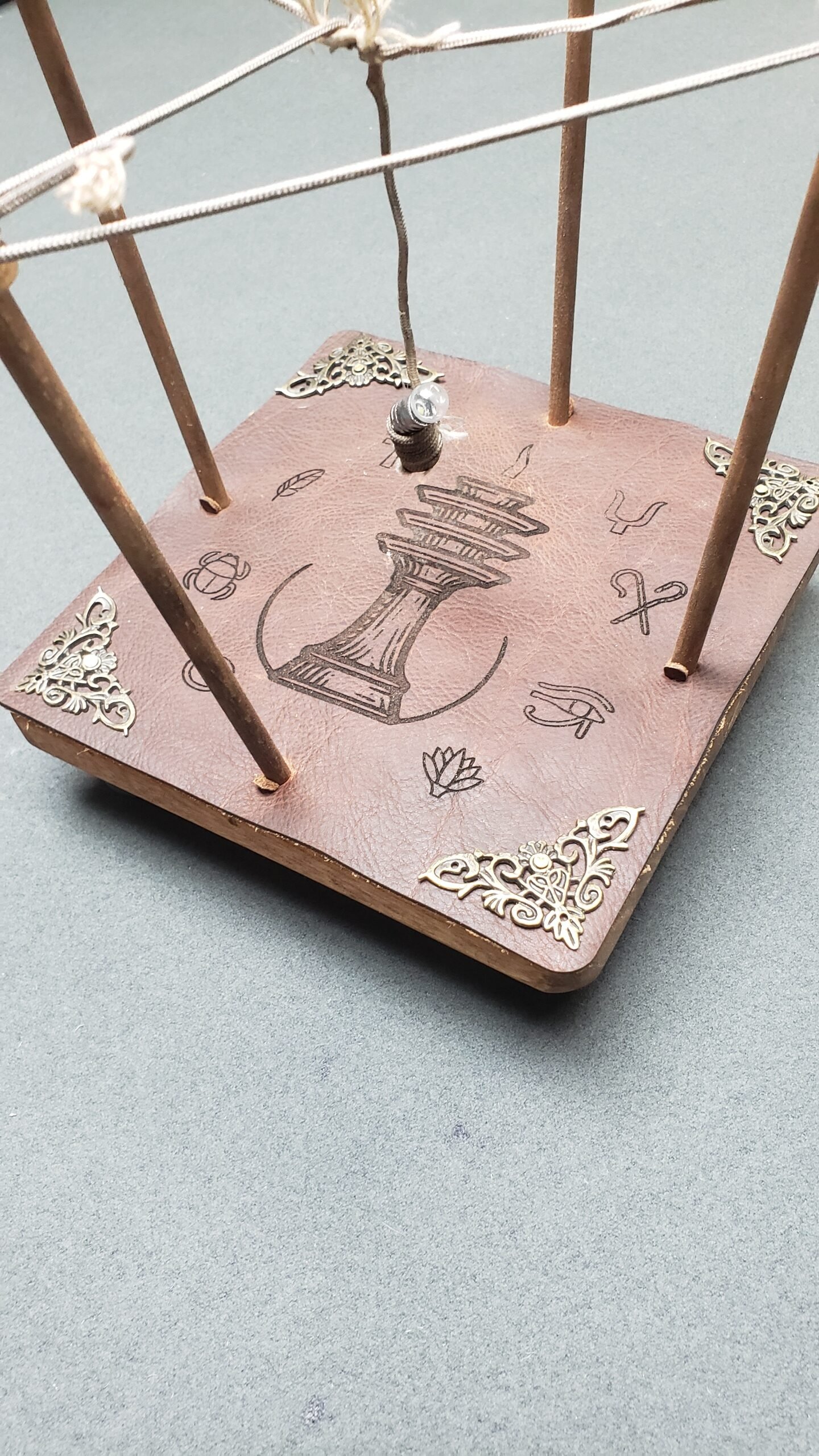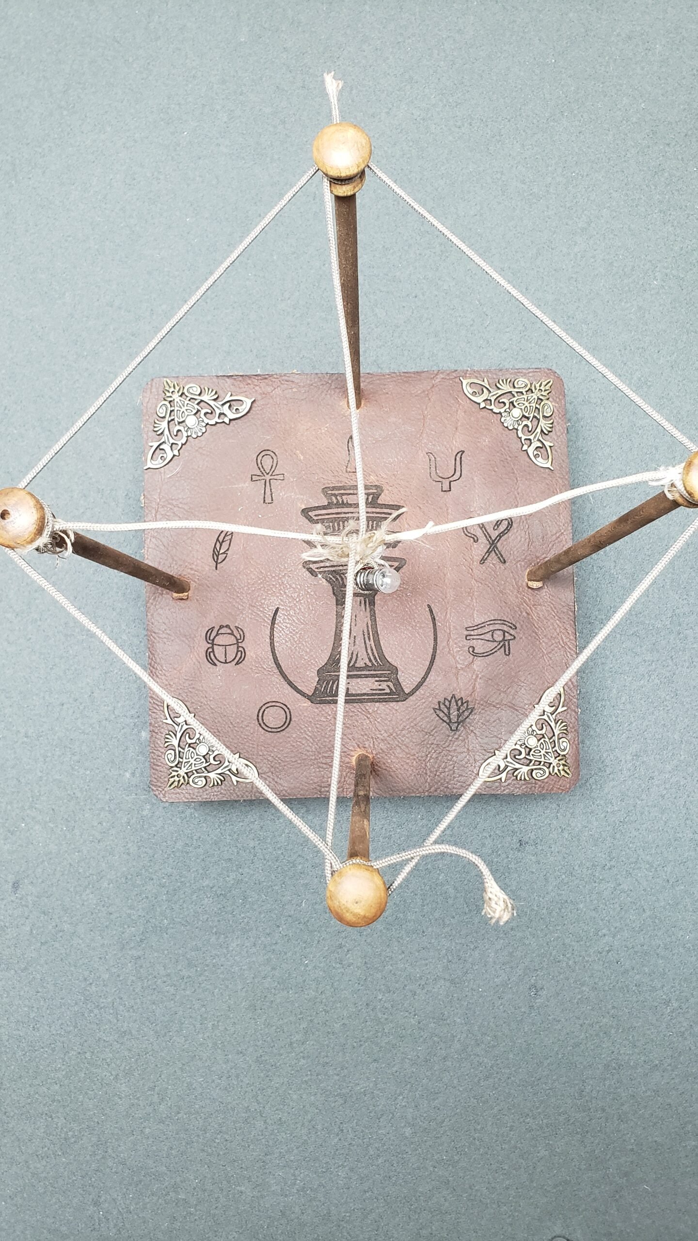 Imagine a handcrafted wooden platform, topped with genuine leather hide, adorned with ancient Egyptian symbols surrounding the sacred Djed pillar a timeless emblem of stability and power. At its center hangs a delicate string, suspended between four dowel rods forming an intricate X-shaped lattice, like an energy catcher or mystical antenna.